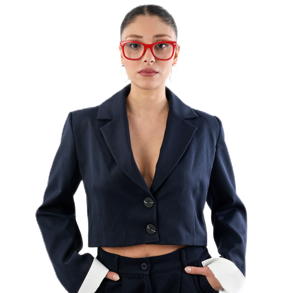 Modern ve güçlü bir siluet sunan bu kısa ceket, lazer kesim formu ve çıkartılabilir gömlek detayıyla farklı kombin seçenekleri sunar.